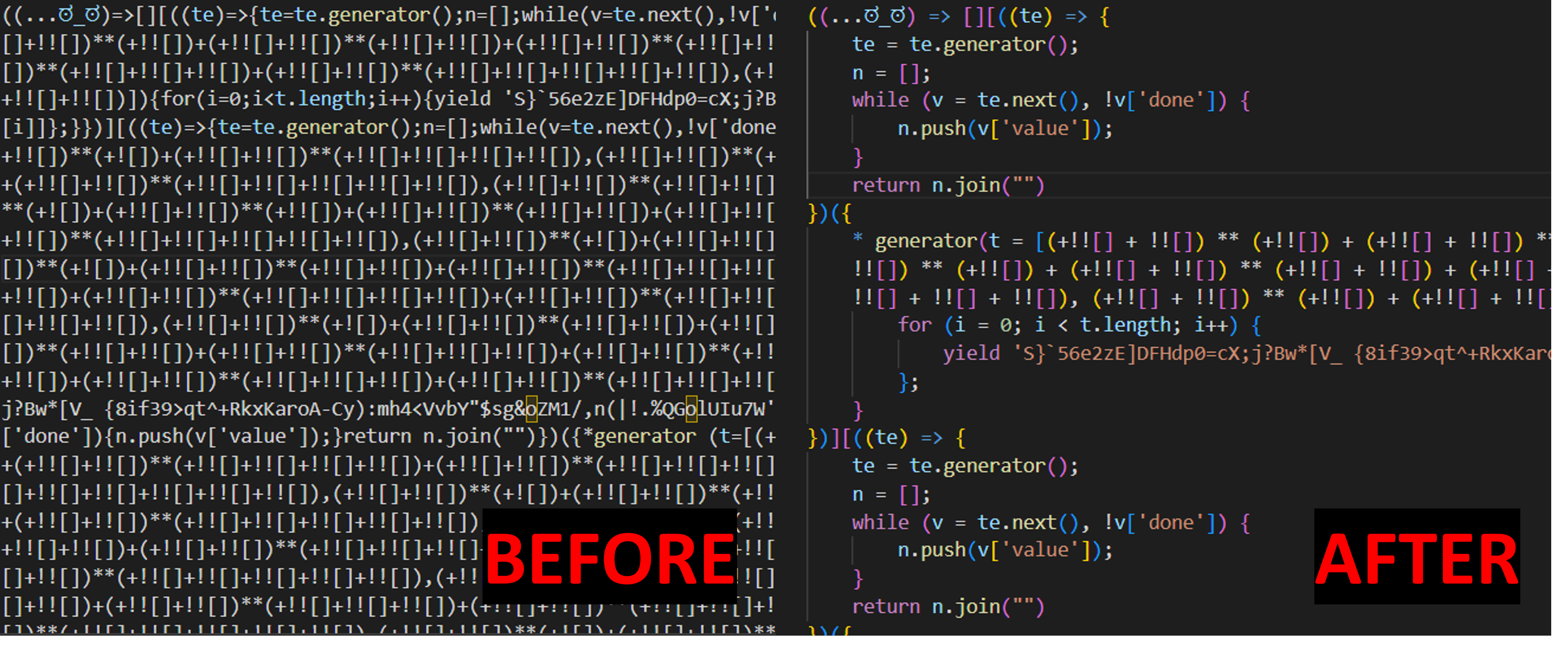 Function t() is the ugliest code so far and ties a bit into cryptography with a custom PRNG represented by e() and like a four-part “decryption” process going on. I tried to break it down a bit and came across a huge breakthrough. The return statement for the function t() spanned lines 21-80, and it was just a boolean check expression1 == expression2. Expression1 went from lines 21-75, and Expression2 was lines 75-80. Wanting to know what the “correct” value was going to be, I threw lines 75-80 into the console: