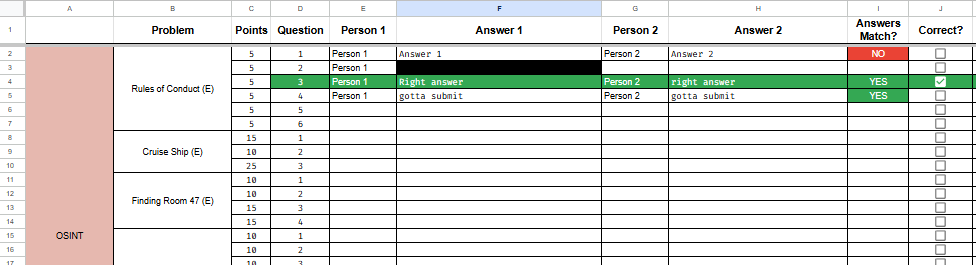 Every single question gets its own row. Cells are merged so each category and problem has each individual question in it. The point values for each question is filled in, along with the names and difficulty. Then, there are two spots for answers (and a spot for who put the answer there to the left of it). When the first person solves the challenge, they put the answer in their slot and the spreadsheet will automatically black it out. This ensures that the answer is preserved, but when a teammate comes along to solve the challenge on their own, they don’t see Person 1’s answer and have that bias their approach. We really want people to independently solve each challenge! Once both people put an answer down, they can see whether the answers match or not. If they don’t, it’s time for some healthy debate and a third person to look at it. Once the answer is submitted, you can check the box. There’s also a couple cells at the bottom to keep track of how many points we’re missing across the board.